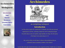 Students complete a webquest on the mathematication, Archimedes. In groups, they pick a topic of interest and design a hand-on experiment for their classmates. They present their material and model the experiment. They complete a...