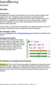 Students complete a worksheet and explore the parabola conic section during a web based activitiy. They answer questions based on their work as they make changes in the features of the parabola.