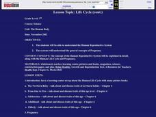 Seventh graders make a collage of the human life cycle. In this life cycle lesson plan students study the human reproductive system and the general concepts of pregnancy. Students receive detailed information about the human life cycle...