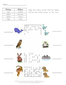 Looking for an ESL worksheet on animals? In this one, learners complete mazes helping the mommy animal find her babies. They write the names of the mommy animals and baby animals next to their pictures. A chart is included with the...