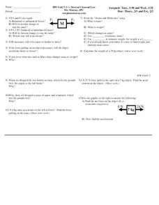 In this Newton's Second Law worksheet, students answer 13 questions about force, mass and acceleration. They calculate weight, force, masses and acceleration of objects.
