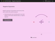 Watch the exponent expression do the negative exponent dance! An interactive lesson uses an animation to show how negative exponents become positive. Learners manipulate the expression and then respond to conceptual questions.