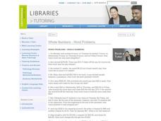 In this whole numbers worksheet, students solve and complete 40 different word problems. First, they determine the amount of a paycheck once income tax is paid. Then, students determine the balance of an account after a deposit described...