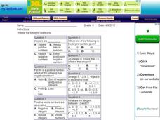 Five questions challenge scholars to show what they know about integers. Using an interactive board game, learners move pieces to discover where a player landed, then answer problems involving both positive and negative integers.