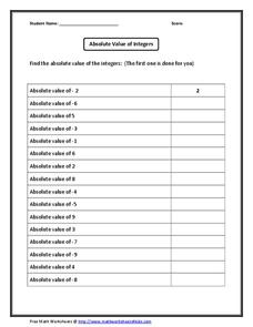 In this absolute values instructional activity, students find the absolute values of positive and negative one digit numbers. Students complete 16 problems.