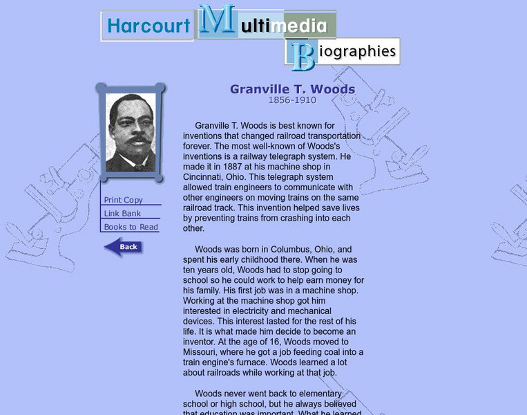 A fascinating biography of Granville T. Woods. It tells of his impact on railroad transportation, and how some of his inventions are still used today. Links with additional information are also available.