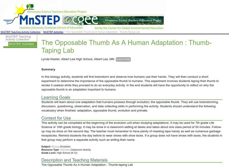 Learners conduct a short experiment to determine the importance of the opposable thumb by taping their thumb to render it useless while they proceed to do an everyday activity. In the end students will have the opportunity to reflect on...