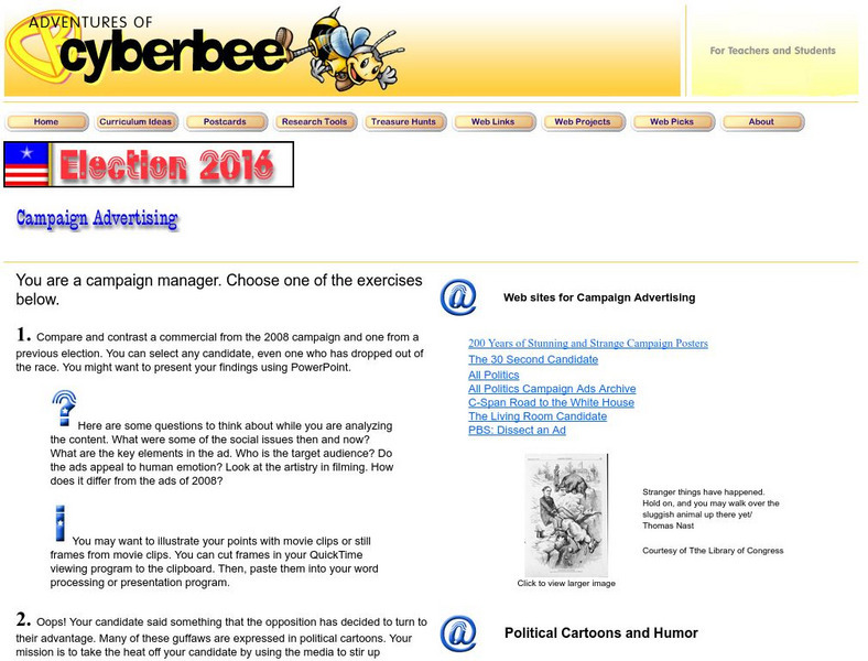 Great PBS site for the Democracy Project. This site is all about televisions role in political advertising. There is a timeline, step-by-step process of commercials, and a look at tricks of the trade.