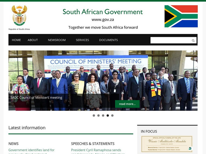 The official portal to the South African government includes information on: government leaders, services, key issues, national departments, and the current news. Of definite interest is the tab entitled About SA. There you will find...