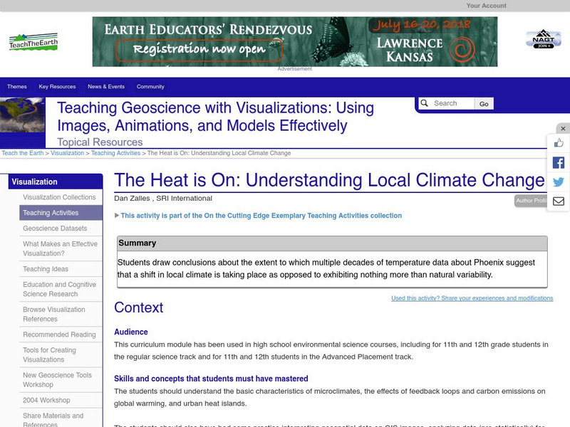 A lesson unit where students analyze long-term weather data for Phoenix to look for changes that have occurred over time. They look at factors that would cause climate warming, including greenhouse gases and other phenomena. They then...