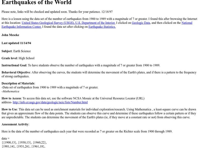 Resource contains a lesson plan that utilizes data from earthquakes. Students are instructed to analyze and interpret line graphs that display the earthquake data.