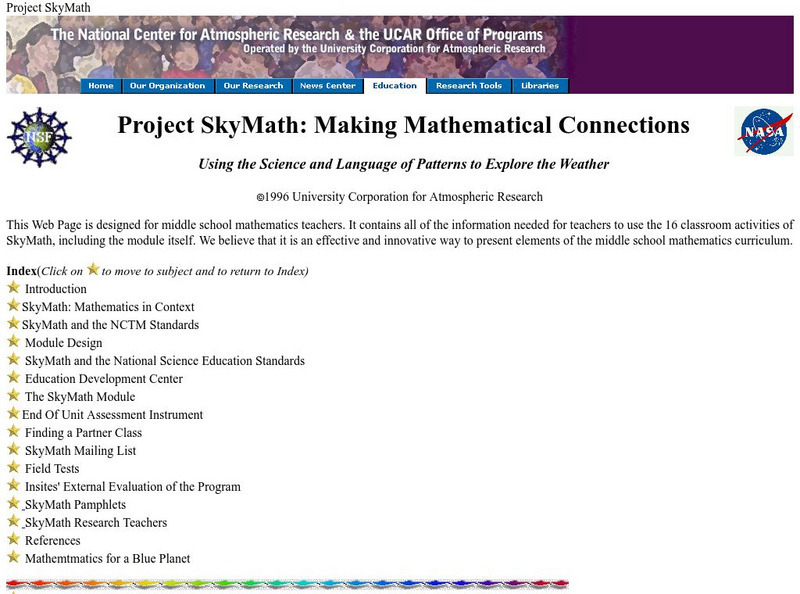 Teachers will be interested to explore the SkyMath module, and the 16 classroom activities at this site. In this program, students will collect and record real-time weather data to analyze. Data analysis, graphing, number relationship,...