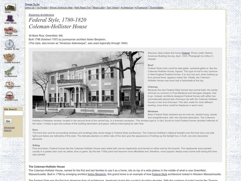 Useful tool for investigating Federal style architectural elements. The interactive image of the Coleman House isolates architectural design elements. Don't miss the resources at the "in the classroom" link.