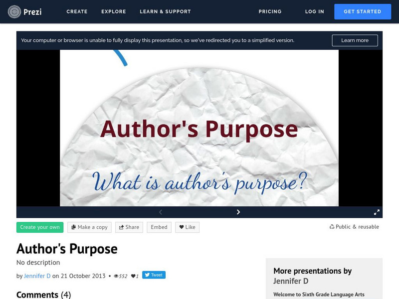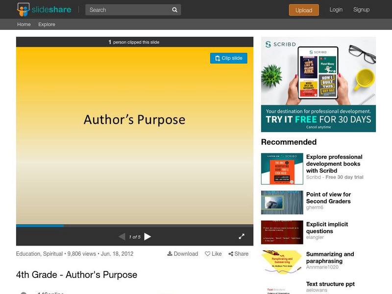 This slideshow lesson focuses on purpose; it defines purpose and lists the two main purposes of all writing: to educate (didactic text meaning to inform and instruct) or to entertain (imaginative text). The purpose could also be art for...