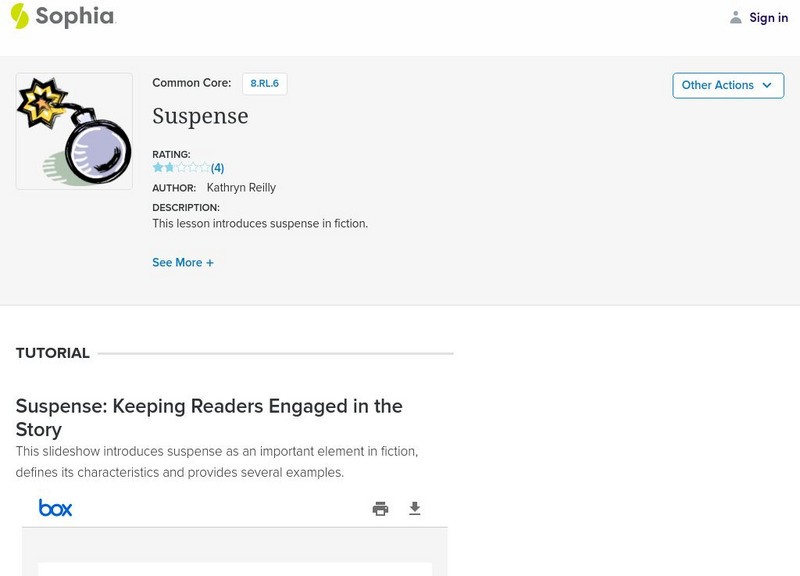 This slideshow focuses on the use of suspense in fiction by stating the purpose of suspense, discussing four ways authors create suspense, showing that all forms of literature contain suspense, and presenting an example with John...