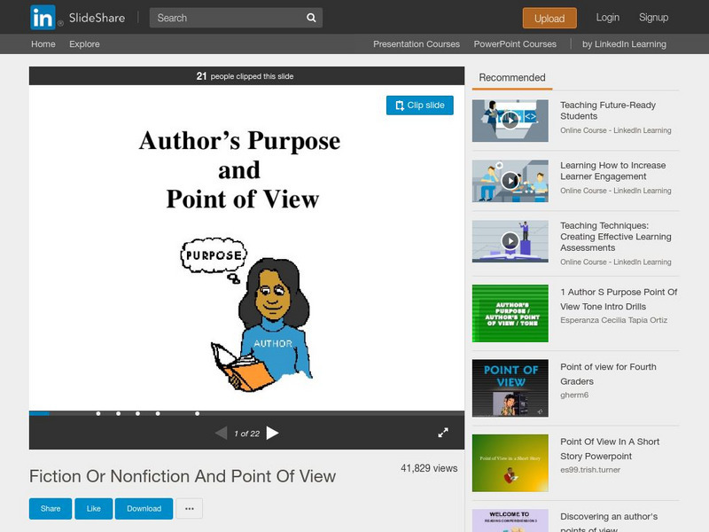 This downloadable slideshow focuses on how an author's purpose and point of view work together in fiction and nonfiction, and how to identify the point of view.
