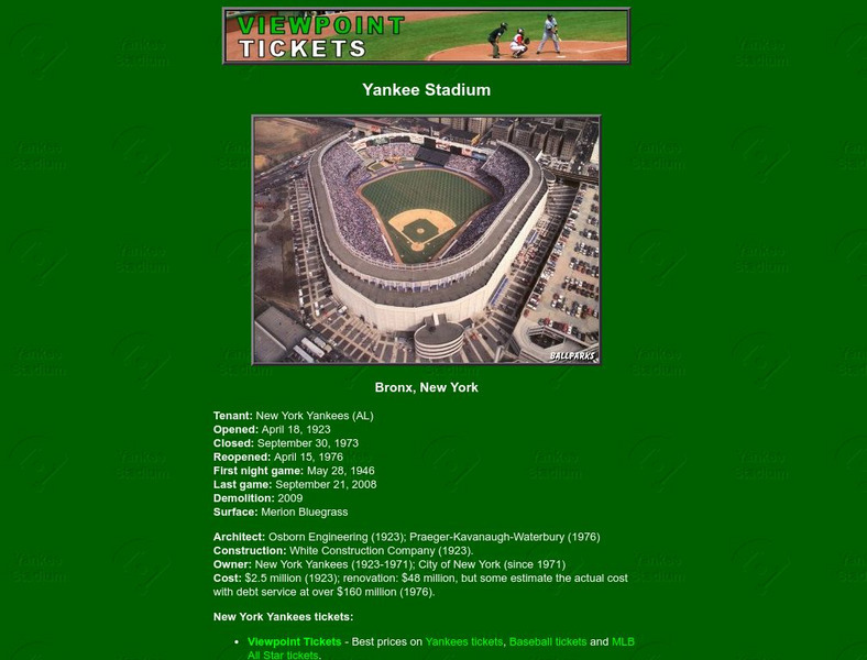 Everything you need to know and more about the historic Yankee Stadium. Learn about the history, capacity, location, dimensions and fences of the stadium. From this site you can learn about other ballparks.