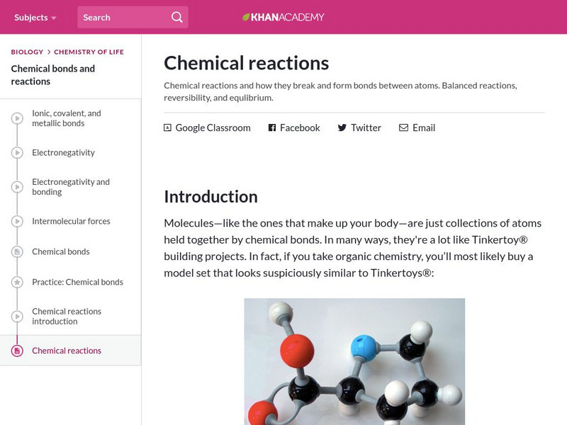Khan Academy: Biology: Chemistry of Life: Chemical Reactions