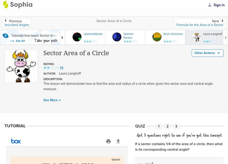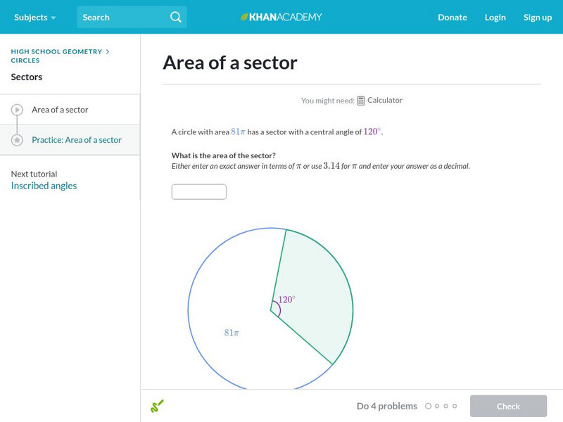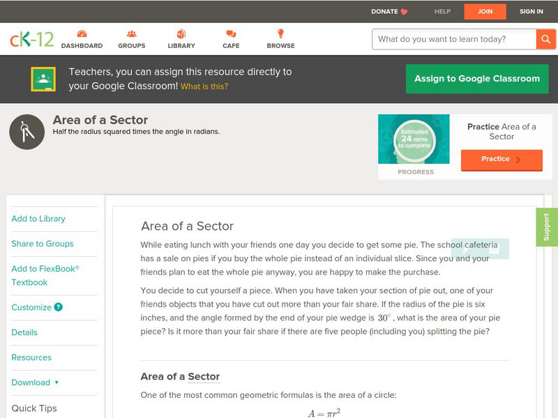 [Free Registration/Login may be required to access all resource tools.] In this lesson students find the area of a sector or segment. Students examine guided notes, review guided practice, watch instructional videos and attempt practice...