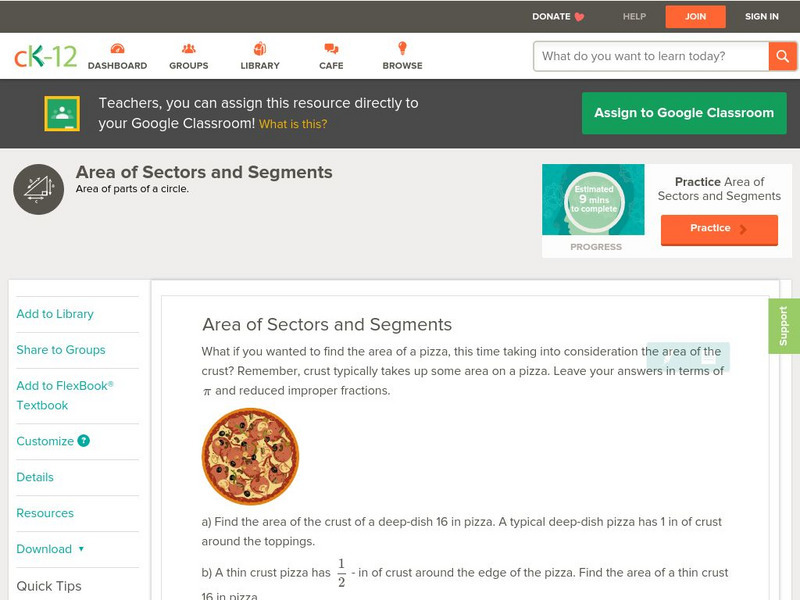 [Free Registration/Login may be required to access all resource tools.] This concept teaches students how to find the area of sectors and segments of circles. Students examine guided notes, review guided practice, watch instructional...