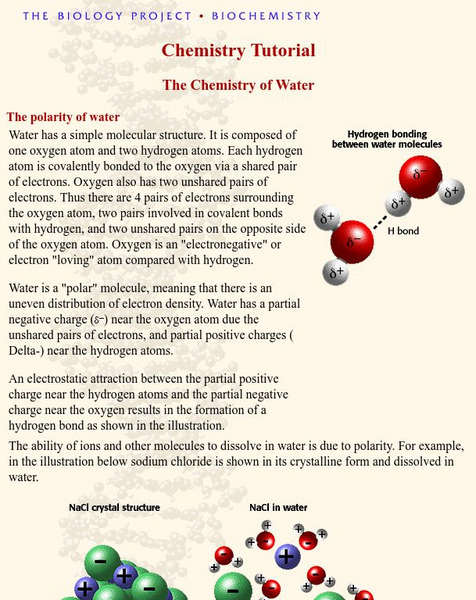 This general tutorial begins with an explanation of the polarity of the water molecule and the effects this polarity has on the properties of water. Goes on to introduce organic molecules and has a thourough tutorial on the third page.