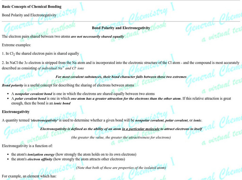 This site talks about ionic, polar covalent, and non-polar covalent bonding.