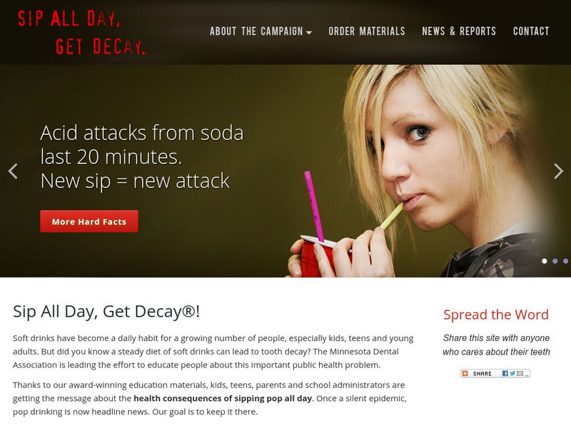 Sip All Day, Get Decay is a comprehensive approach to eliminating tooth decay. Learn how you can stop the spread of cavities, gum disease and tooth decay simply by reducing the number of soft drinks you drink each day. Take the Soda Pop...