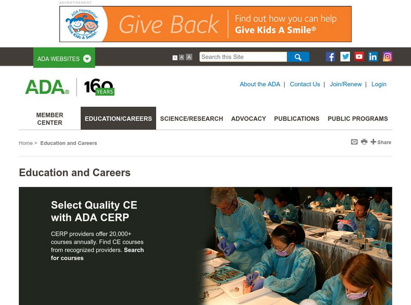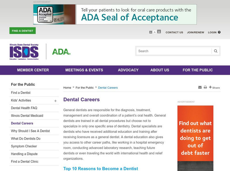 From the American Dental Association, this page informs those with an interest in a career in dentistry. It includes information about professional associations, "day in the life" profiles of dentists, a list of ten reasons dentists...