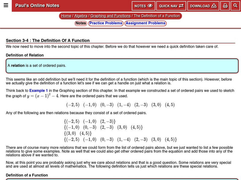 Students learn about relations and functions. The lesson explores functional notation, domain, range, and one-to-one functions. The tutorial includes class notes, calculator tips, examples, and practice problems with solutions. The...