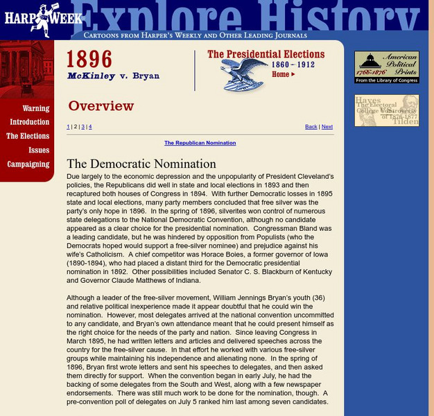 A three-page look at the campaign and election of 1896 in which William McKinley, the Republican candidate, ran against Wiliam Jennings Bryan, the Democratic candidate. Read about the nominating conventions, the platforms, and the...