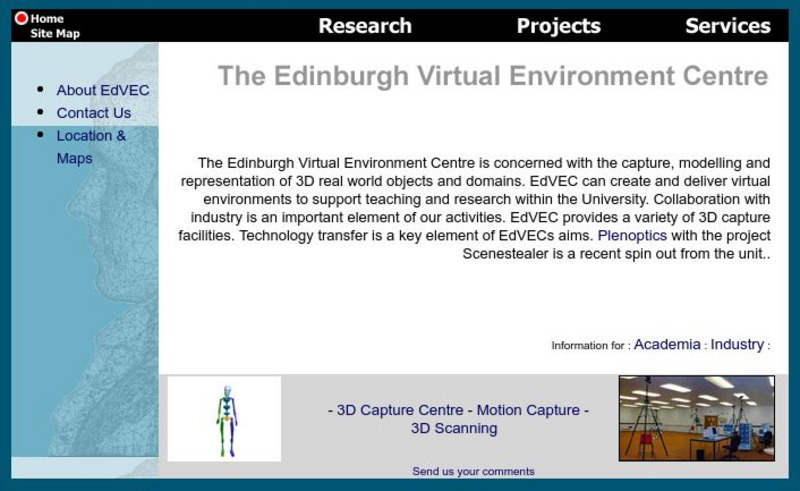 The Edinburgh Virtual Environment Center's philosophy deals with capturing, modeling and representation of 3D real world objects and domains. Explore this and more at this site.
