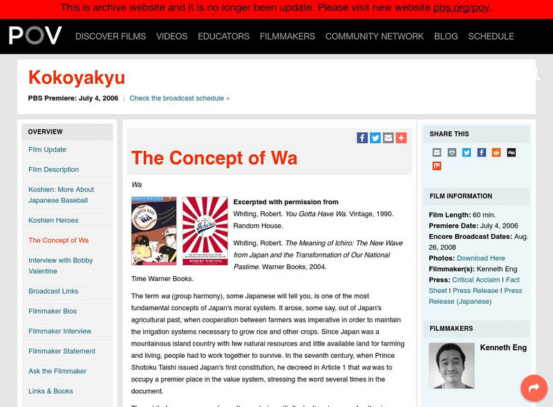 Part of a larger P.O.V. site about high-school-level baseball in Japan, this page delves into the meaning of "wa," a code of behavior that underscores the Japanese sense of group harmony, especially as it applies to the team sport of...