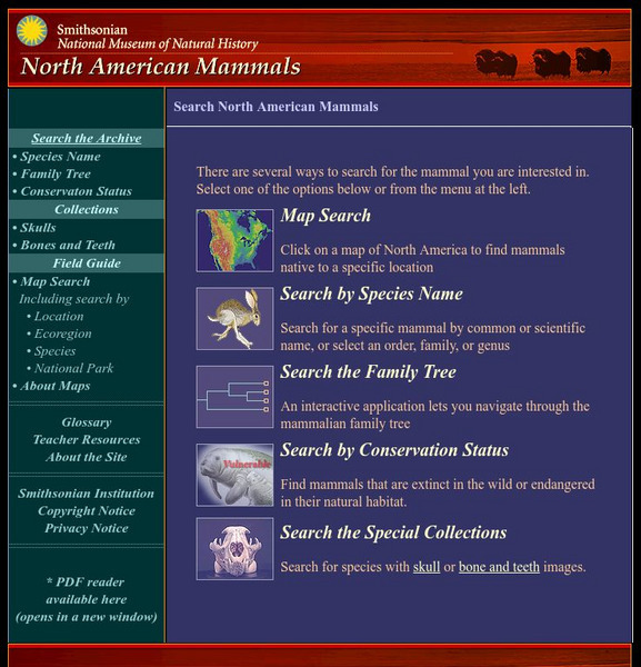 The National Museum of Natural History provides users the opportunity to create personalized field guides of North American mammals based on a wide variety of search options.