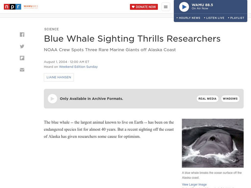 National Public Radio reports on the blue whale, which has been on the endangered species list for almost 40 years. Find out why a recent siting off the coast of Alaska has given researchers some cause for optimism.
