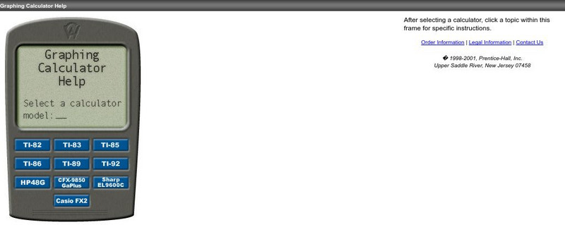 This site gives an in depth tutorial on the TI-82 graphing calculator. With each step in the tutorial, a picture of the calculator is shown that can be enlarged.