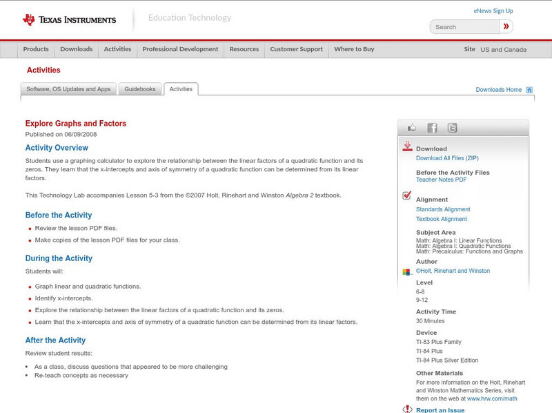 Students use a graphing calculator to explore the relationship between the linear factors of a quadratic function and its zeros. They learn that the x-intercepts and axis of symmetry of a quadratic function can be determined from its...