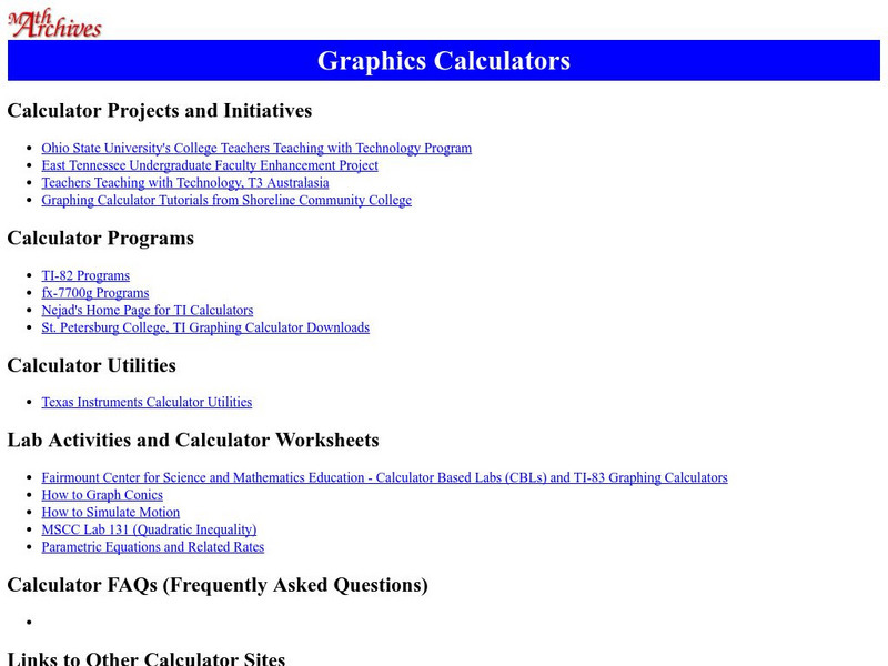 Provided here are many links to calculator projects, programs, utilities, lab activities, and worksheets. A good resource for educators to have when needed!