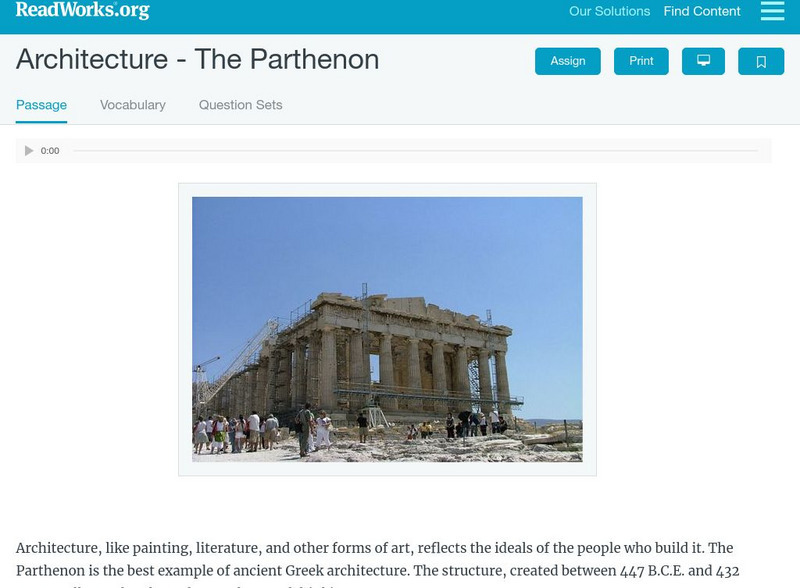 [Free Registration/Login Required] An informational text about The Parthenon as an example of ancient Greek architecture. A question sheet is available to help students build skills in reading comprehension.