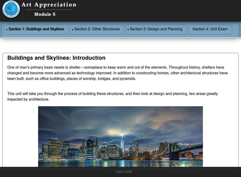In this sixth unit of a course on Art Appreciation, students learn about the history of architecture, including ancient Greek and Roman works. They will learn about Frank Lloyd Wright and about Islamic architecture. They will also look...