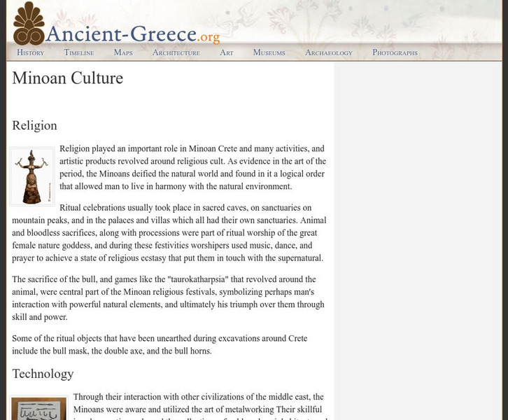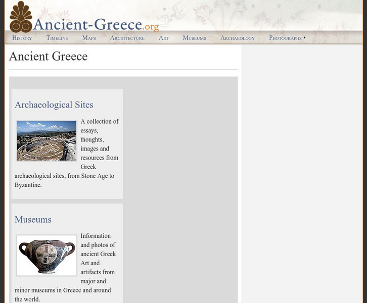 Massive site for information on the ancient Greek world. Follow the navigation at the top of the page for detailed sections on time periods, daily life, religion and death, economy, and more. Each section includes pictures of artifacts...