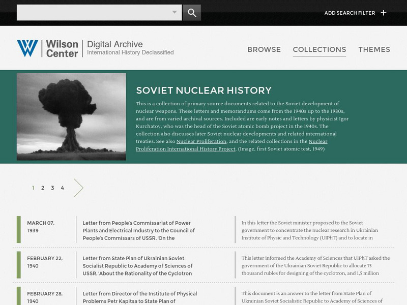 A digital archive of documents from the 1940s-1980s that relate to the nuclear weapons race in the Soviet Union. Included in archive are notes from the head of the Soviet atomic bomb project, Igor Kurchatov and documents related to...