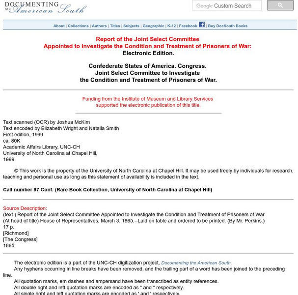 The official report by a joint select committee of the Congress of the Confederate States of America investigating the treatment of prisoners of war in Confederate prisons. An interesting look at a primary source document reflecting the...