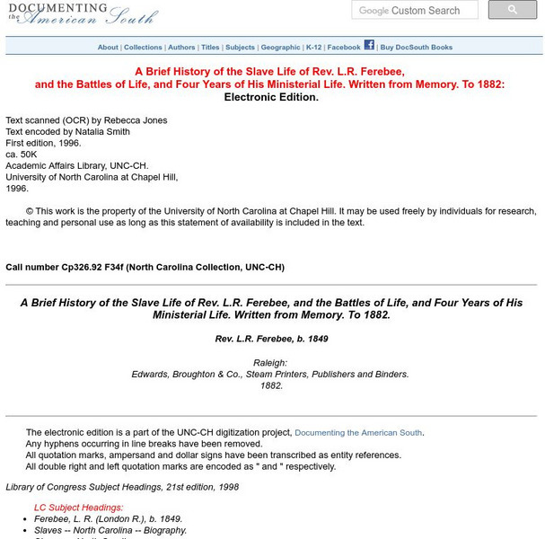 Documenting the American South: Rev. L. R. Ferebee. Written From Memory