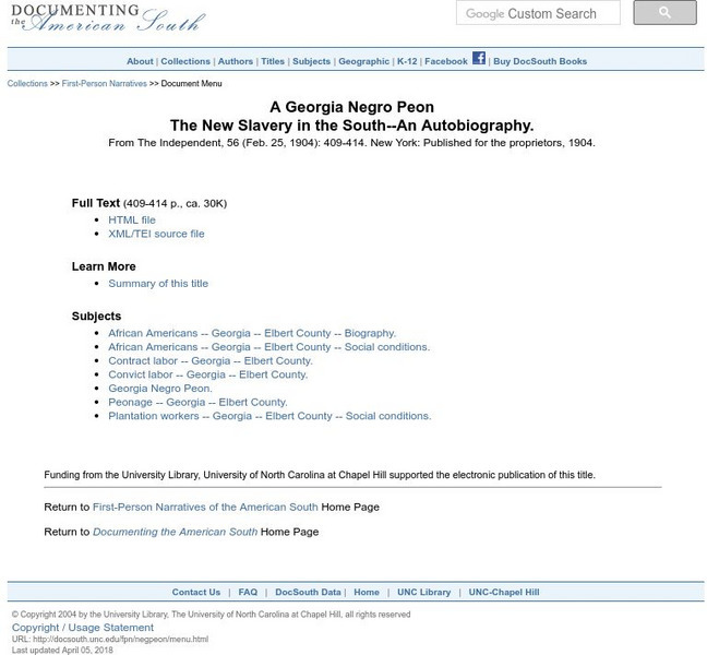 This autobiography of an African-American man relates his experiences as a free laborer in Georgia after the Civil War. You will see that he felt his conditions were not unlike the slavery that existed before the Civil War. From the...