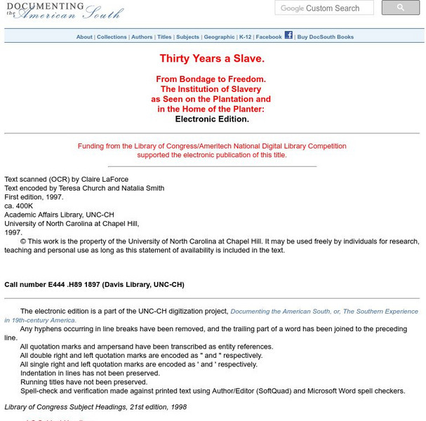 From the extensive site, "Documenting the American South," read Louis Hughes' "Thirty Years a Slave: From Bondage to Freedom: The Institution of Slavery as Seen on the Plantation and in the Home of the Planter," which was originally...