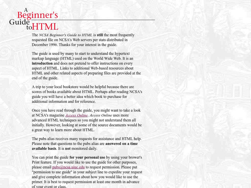 Site provides a guide which is intended to be an introduction to using HTML and creating files for the Web.