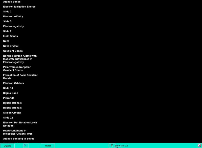 This slide show on atomic bonds contains several slides on electron affinity. Other topics include covalent, Sigma and Pi bonds, and atomic bonding in solids.