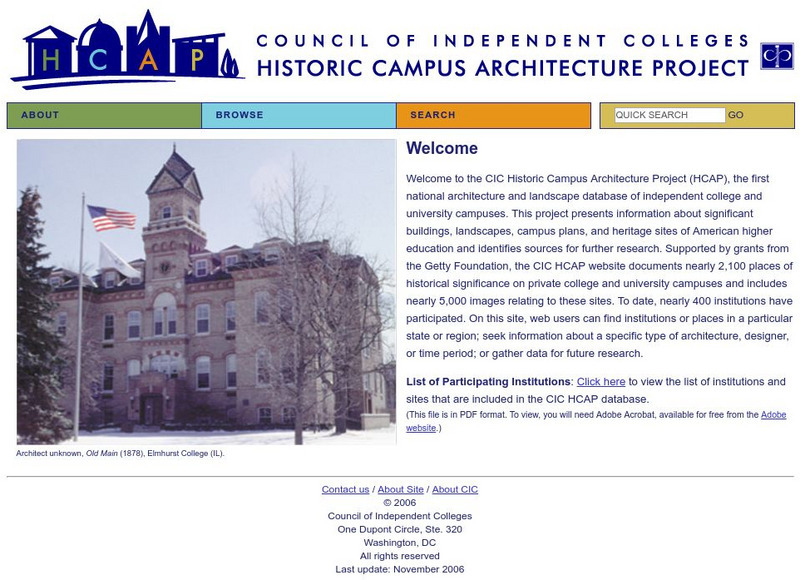 Explore this database of independent colleges that has a compilation of information and pictures of significant architecture, landscaping, and campus plans. You can browse by time period, university name, and type of architecture.