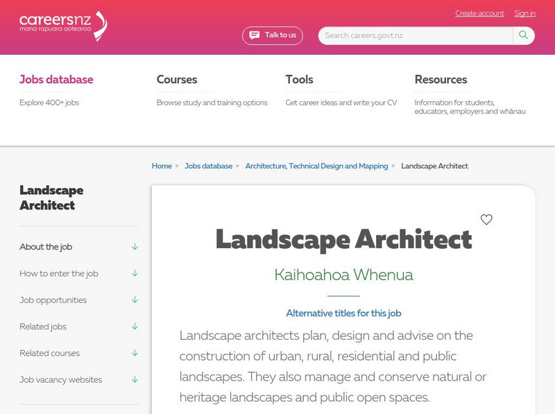 This site has a good description of the nature of working as a landscape architect. Qualifications, education job outlook and earnings, with links to realted occupations are included in this site.