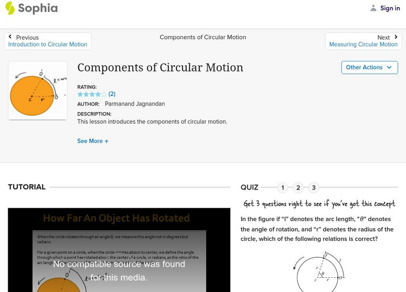 A video lesson that introduces the components of circular motion. Understand that any objects that rotates around a point is in circular motion. Video also explores how to measure how far an object has rotated. Video gives equation for...